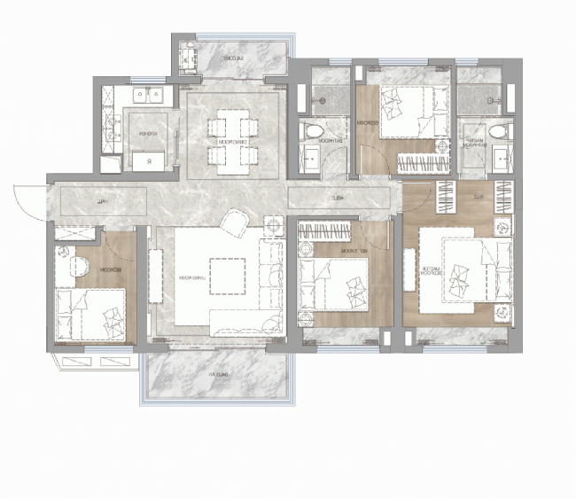 室内交付,整体动静分区、功能分区,设计上,采用米色花纹瓷砖+波导线的地板,使得空间更为开阔。