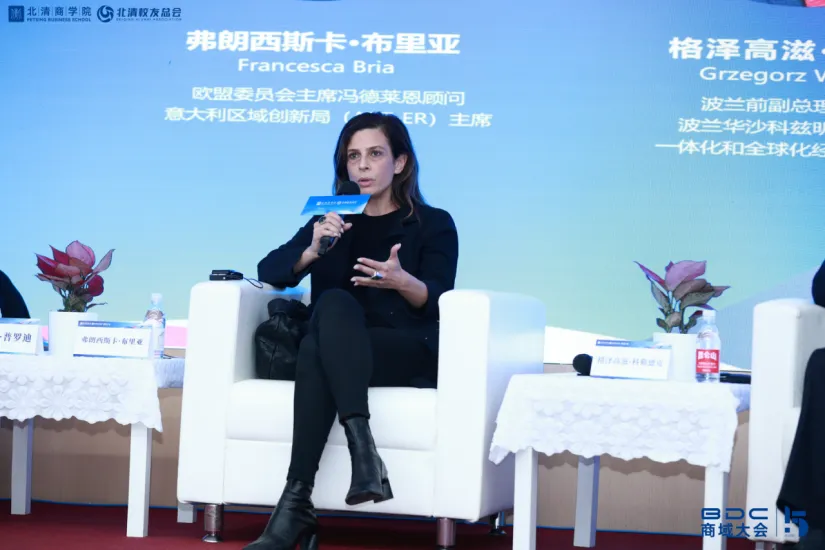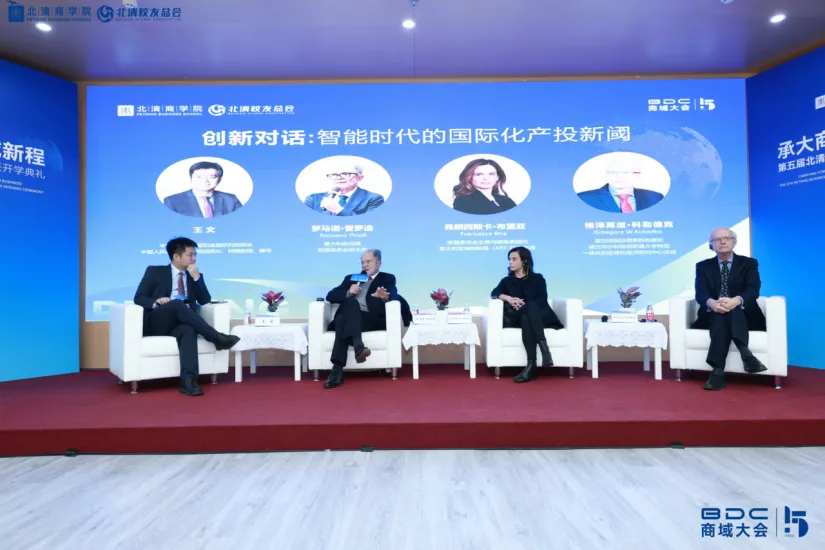 跨国论坛《创新对话:智能时代的国际化产投新阈》成为本次大会的最大亮点。中国人民大学重阳金融研究院院长王文,欧盟委员会前主席、意大利前总理罗马诺·普罗迪,欧盟委员会主席冯德莱恩顾问、意大利区域创新局主席弗朗西斯卡·布里亚,波兰前副总理兼财政部长格泽高滋·科勒德克受邀走进北清商学院,共同探讨智能时代中欧投资与合作新路径。