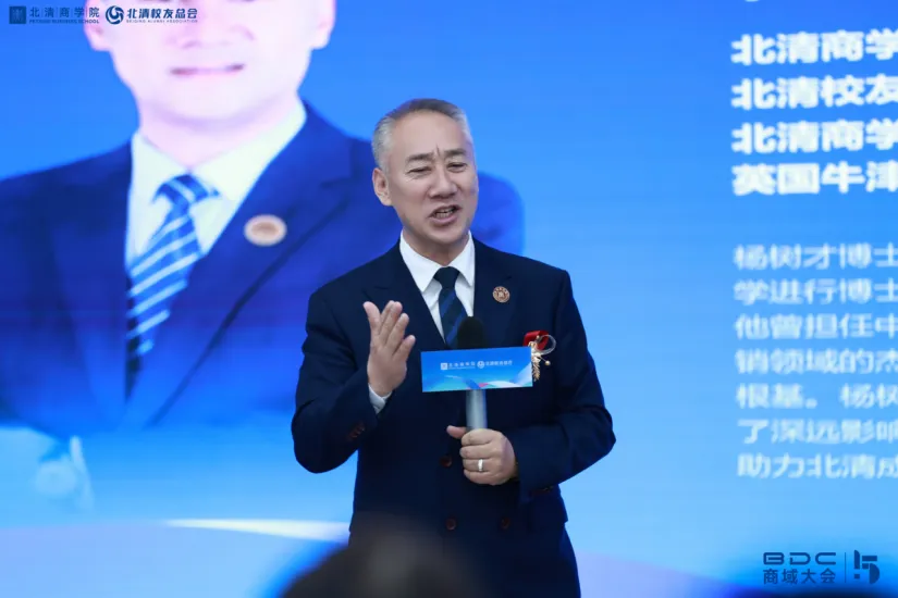 北清商学院战略品牌与公共影响力高级院长、北清校友总会常务副会长杨树才分享了北清校友会的生态发展理念。他首先回顾了自己从商场历练三十年后,选择来到北清商学院深造,完成从硕士、博士到牛津大学博士后的学术历程。“是北清塑造了我,”他深情表示,“正因如此,我选择留下来,投身校友会工作——就是希望帮助每一位学员,在技术、资源、需求等多个维度实现真正的成长与发展。”